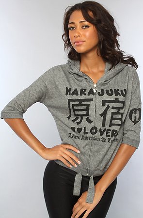 Harajuku Lovers The Tall Girl Hoody hood ,Sweatshirts for Women: Model is wearing a size Small 3/4 sleeve hooded sweatshirt with screen print on front and back; ribbed cuffs/hem; and drawcord at hem; 100% cotton. By Harajuku Lovers